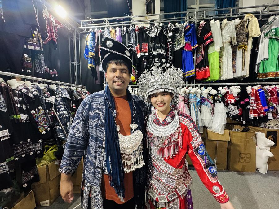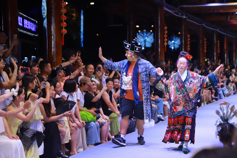 At Kaili's "Village T" fashion show, Kuch wore batik and Miao silver accessories. His hundred-bird coat, a typical costume named after Miao's ancient ancestor bird, shimmered alongside ethnic minority models, echoing ancient heritage. International youth joined in diverse attire, illuminating the runway with global cultures as local audiences cheered.