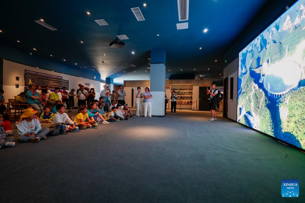 This photo taken on July 10, 2025 shows a staff member explaining an exhibit for visitors at a planetarium in Kedu Town, Pingtang County of southwest China's Guizhou Province. (Xinhua/Yang Wenbin)