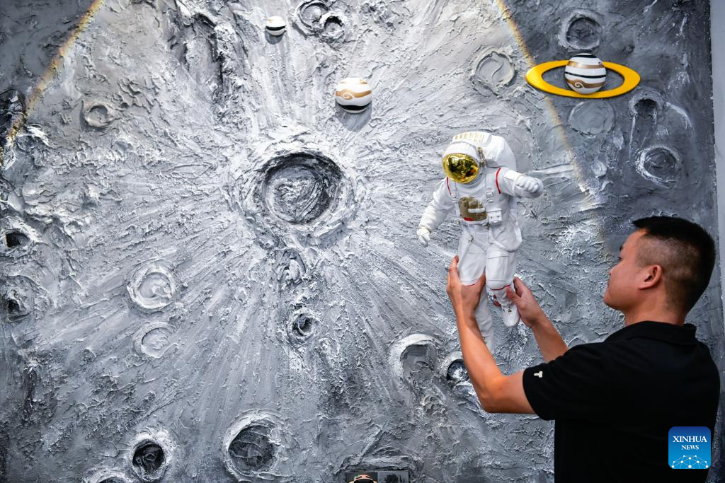 This photo taken on July 9, 2025 shows an owner of a homestay hanging an astronaut-shaped decoration onto the wall at the "Astronomy Town" in Kedu Town, Pingtang County of southwest China's Guizhou Province. (Xinhua/Yang Wenbin)