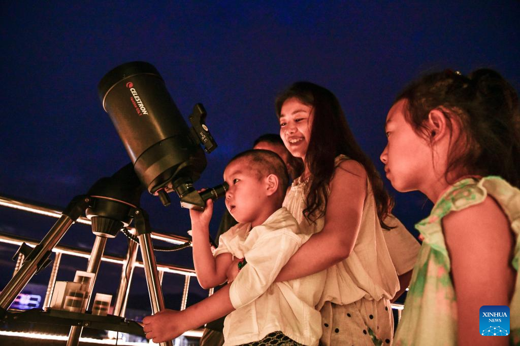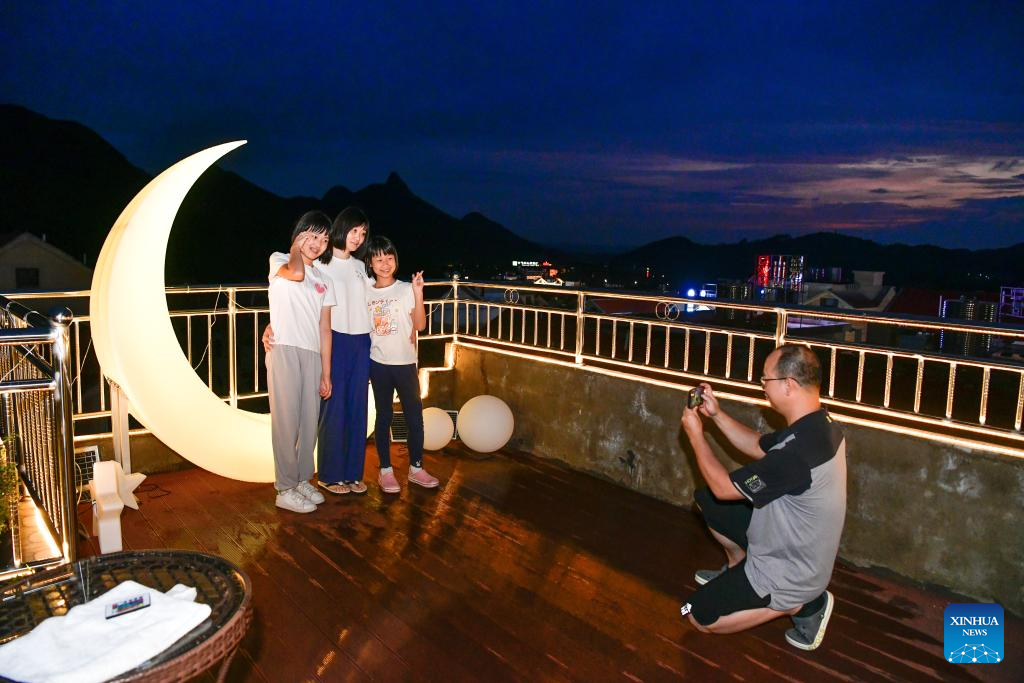 This photo taken on July 9, 2025 shows visitors observing stars with a telescope of a homestay at the "Astronomy Town" in Kedu Town, Pingtang County of southwest China's Guizhou Province. (Xinhua/Yang Wenbin)