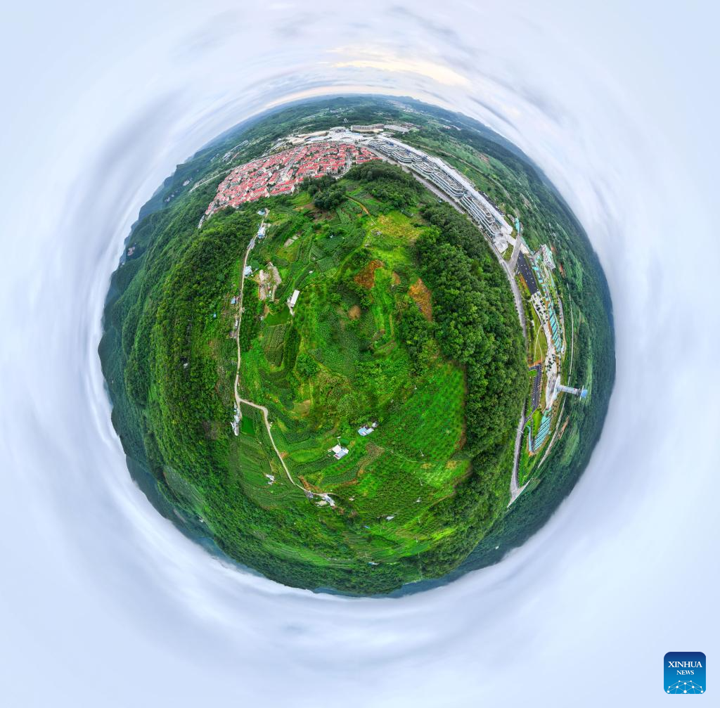 An aerial drone panoramic photo taken on July 9, 2025 shows the "Astronomy Town" in Kedu Town, Pingtang County of southwest China's Guizhou Province. (Xinhua/Yang Wenbin)