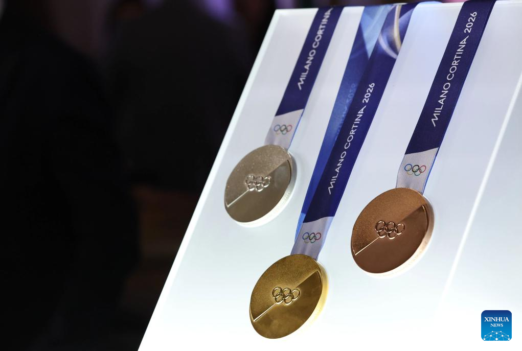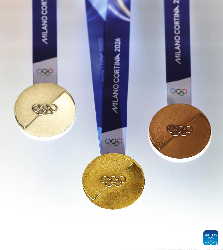 The medals for Milano Cortina 2026 Olympic and Paralympic Winter Games are displayed during the unveiling ceremony in Palazzo Balbi, Venice, Italy, on July 15, 2025. (Xinhua/Li Jing)