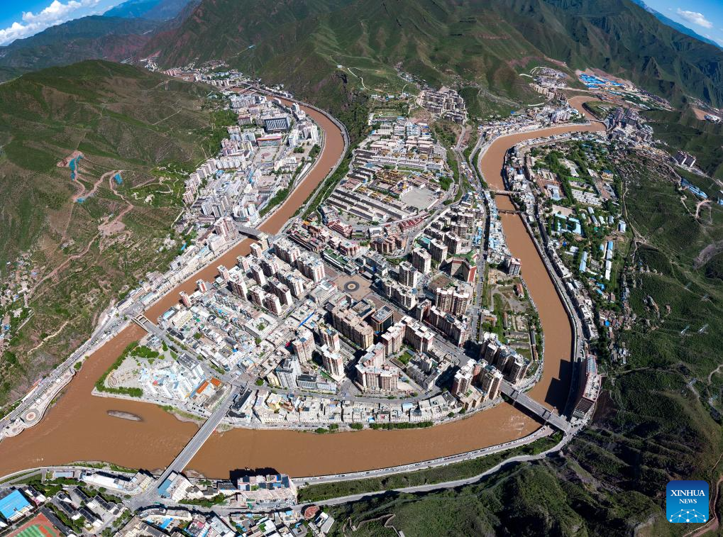 An aerial drone photo taken on June 21, 2025 shows a view of Qamdo City, southwest China's Xizang Autonomous Region. (Xinhua/Jiang Fan)