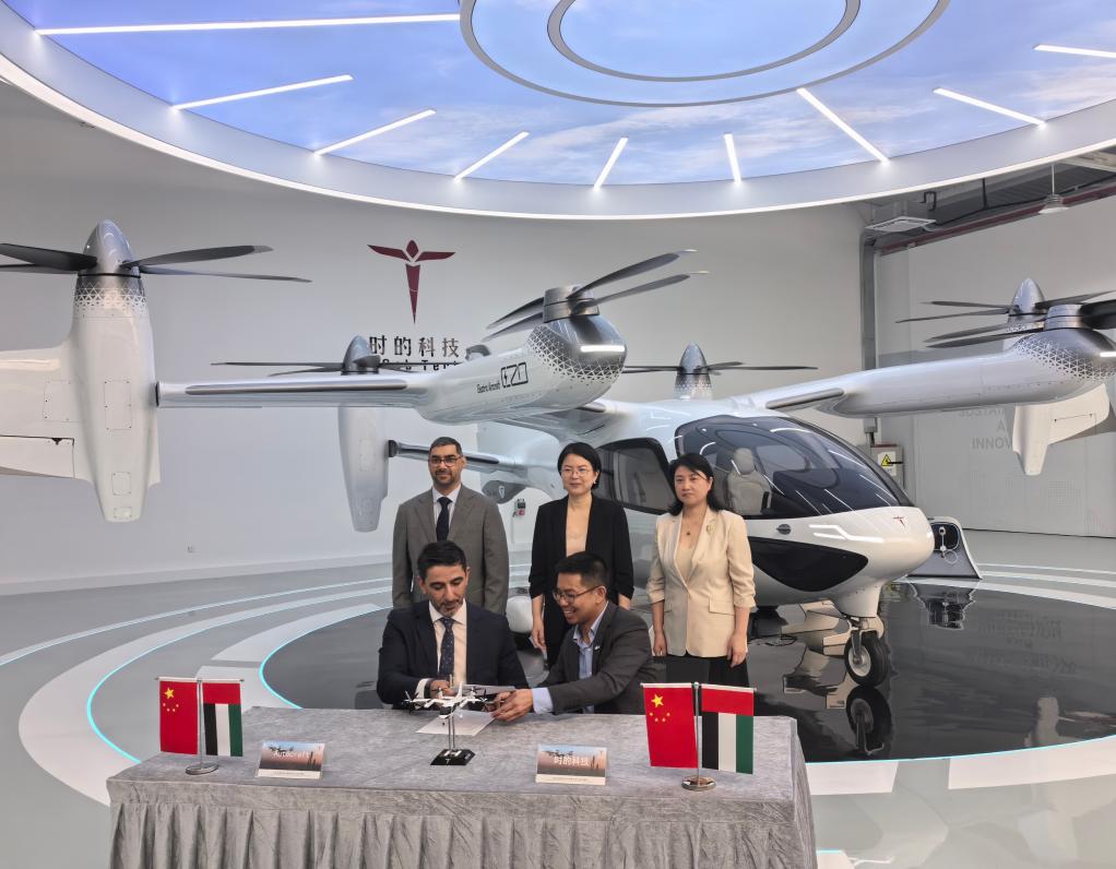 SHANGHAI, July 16 (Xinhua) -- Autocraft from the United Arab Emirates (UAE) signed a memorandum of understanding (MoU) with the Chinese electric vertical takeoff and landing (eVTOL) maker Shanghai TCab Technology Co., Ltd. here on Wednesday on purchasing 350 E20 eVTOL aircraft worth 1 billion U.S. dollars.