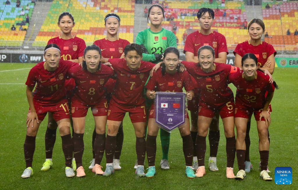 Players of China pose for a group photo before the women's football match between Japan and China at the EAFF (East Asian Football Federation) E-1 Football Championship 2025 Final in Suwon, South Korea, July 16, 2025. (Xinhua/Yao Qilin)