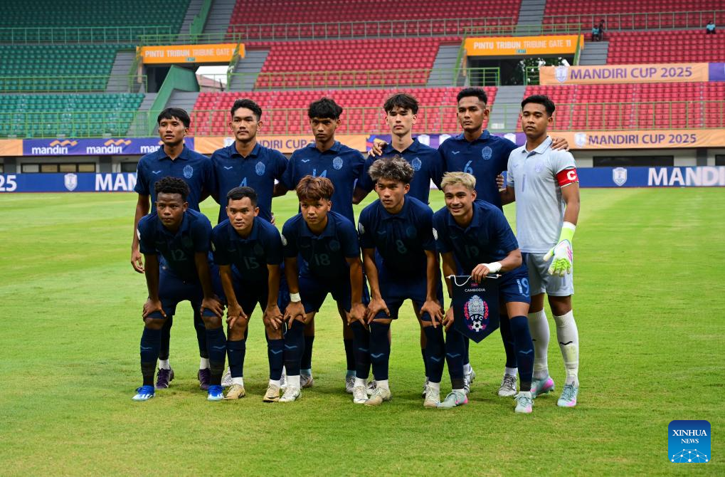 Cambodia's players pose for a group photo before the ASEAN Football Federation (AFF) U23 Championship 2025 Group B match between Cambodia and Laos in Bekasi, Indonesia on July 16, 2025. (Xinhua/Zulkarnain)