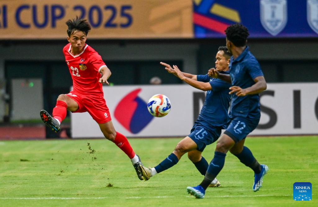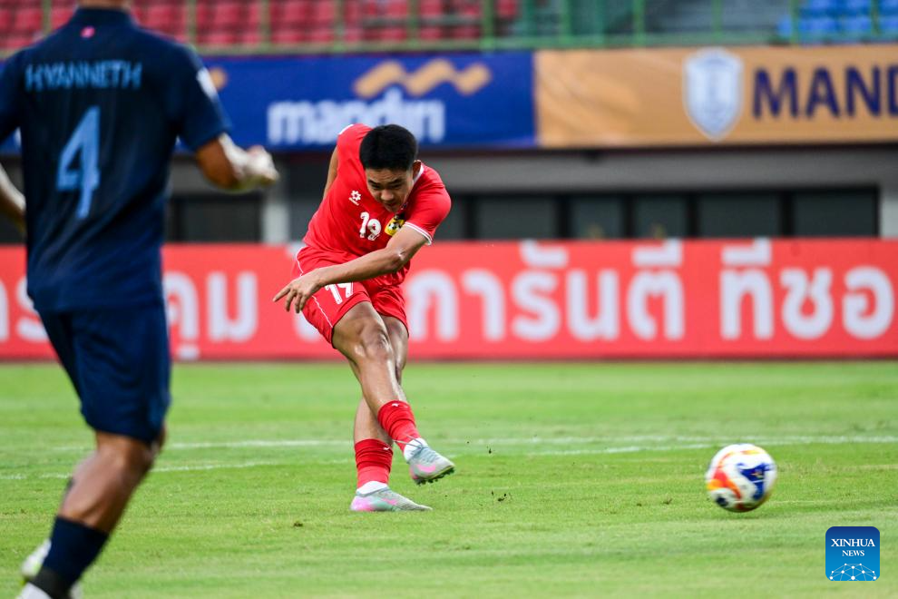 Phousomboun Panyavong of Laos shoots the ball during the ASEAN Football Federation (AFF) U23 Championship 2025 Group B match between Cambodia and Laos in Bekasi, Indonesia on July 16, 2025. (Xinhua/Zulkarnain)