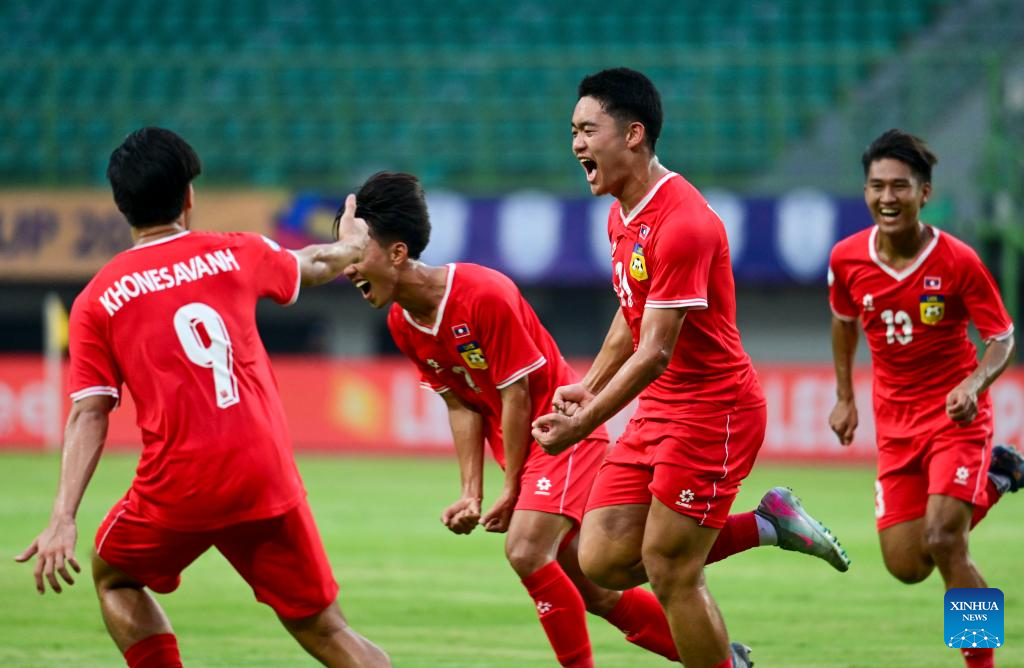 Phousomboun Panyavong (2nd R) of Laos celebrates after scoring during the ASEAN Football Federation (AFF) U23 Championship 2025 Group B match between Cambodia and Laos in Bekasi, Indonesia on July 16, 2025. (Xinhua/Zulkarnain)
