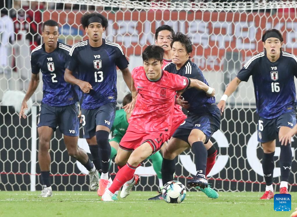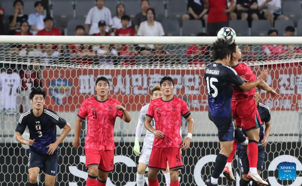 Park Jinseob (3rd L) of South Korea competes during the men's final match between Japan and South Korea at the EAFF (East Asian Football Federation) E-1 Football Championship 2025 Final in Yongin, South Korea, July 15, 2025. (Xinhua/Yao Qilin)