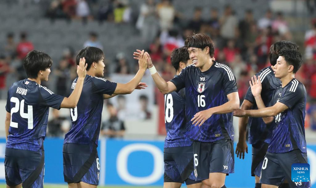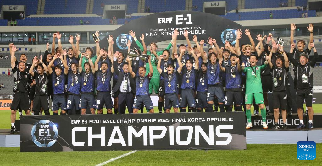 Players of Japan celebrate winning the men's final match between Japan and South Korea at the EAFF (East Asian Football Federation) E-1 Football Championship 2025 Final in Yongin, South Korea, July 15, 2025. (Xinhua/Yao Qilin)