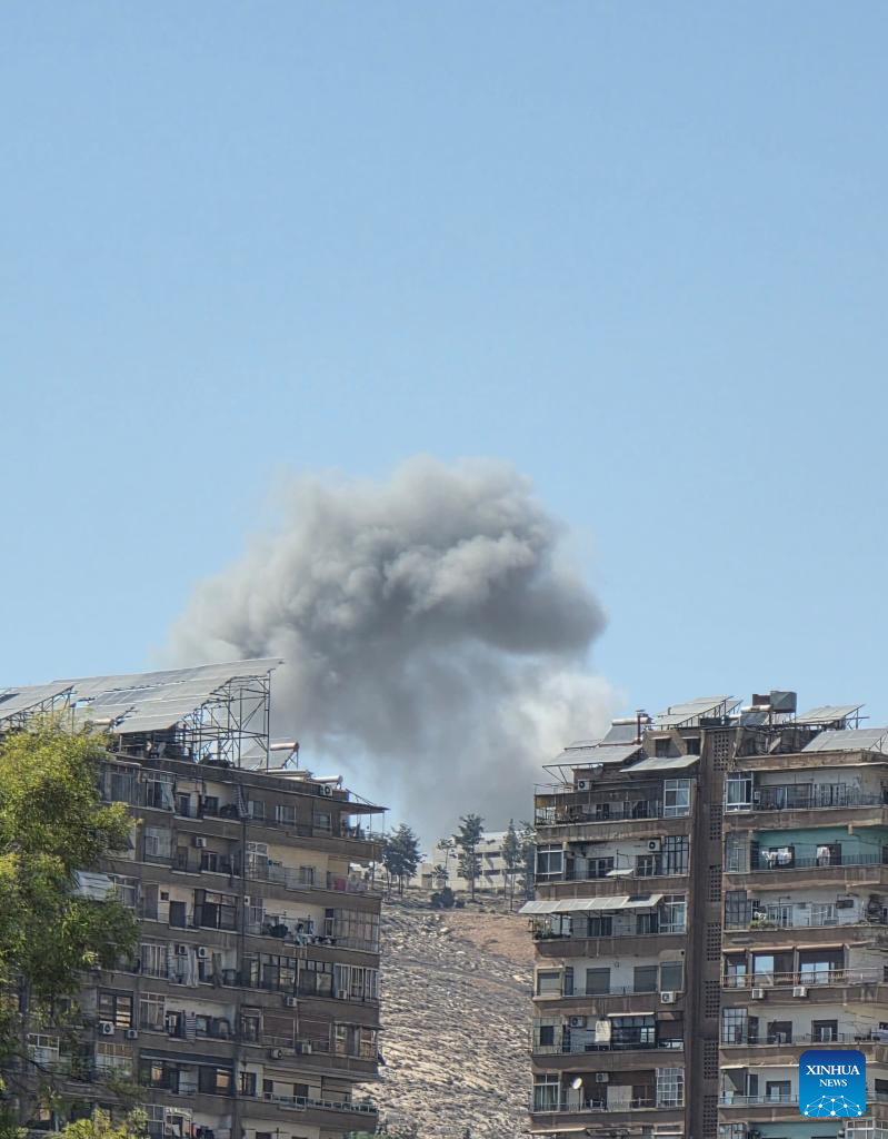 Smoke rises from the Syrian presidential palace, which was hit by Israel, in Damascus, Syria, July 16, 2025. (Photo by Hummam Sheikh Ali/Xinhua)