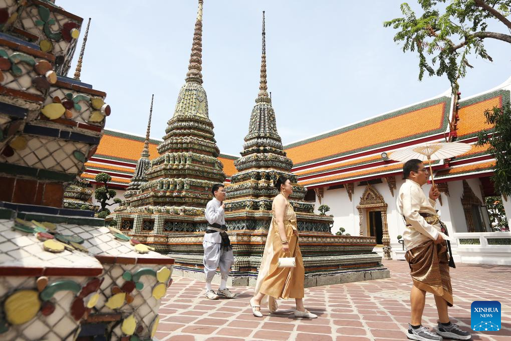 Tourists in traditional Thai costumes visit the Wat Pho temple in Bangkok, Thailand, July 15, 2025.