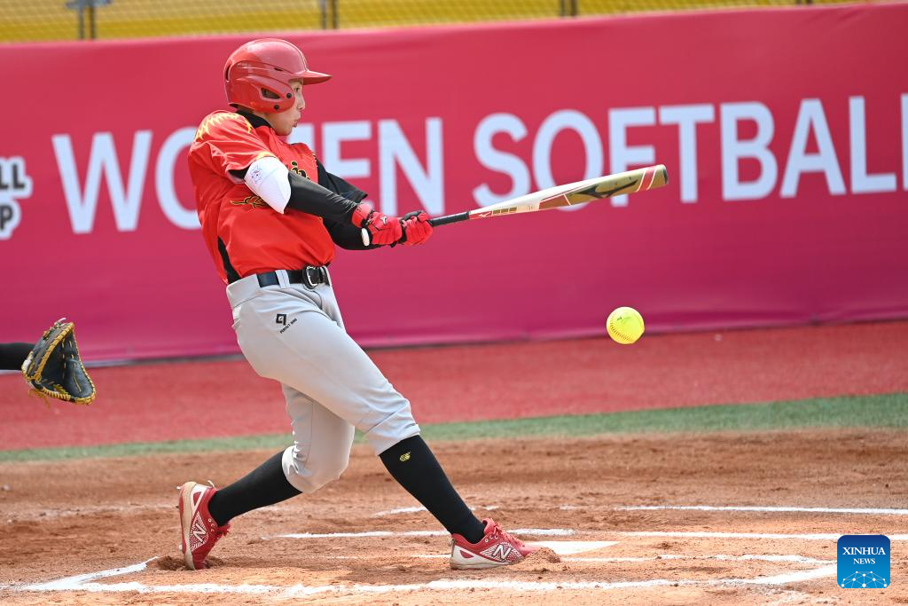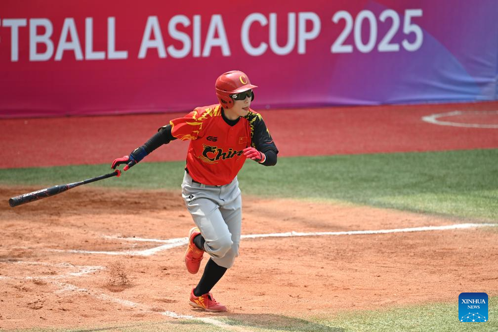 Wang Bei of China competes during the round robin match between China and Singapore at the WBSC Women Softball Asia Cup 2025 in Xi'an, northwest China's Shaanxi Province, July 16, 2025. (Xinhua/Zou Jingyi)