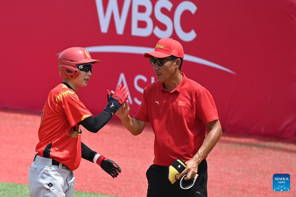 Ren Min (L) of China celebrates with coach during the round robin match between China and Singapore at the WBSC Women Softball Asia Cup 2025 in Xi'an, northwest China's Shaanxi Province, July 16, 2025. (Xinhua/Zou Jingyi)