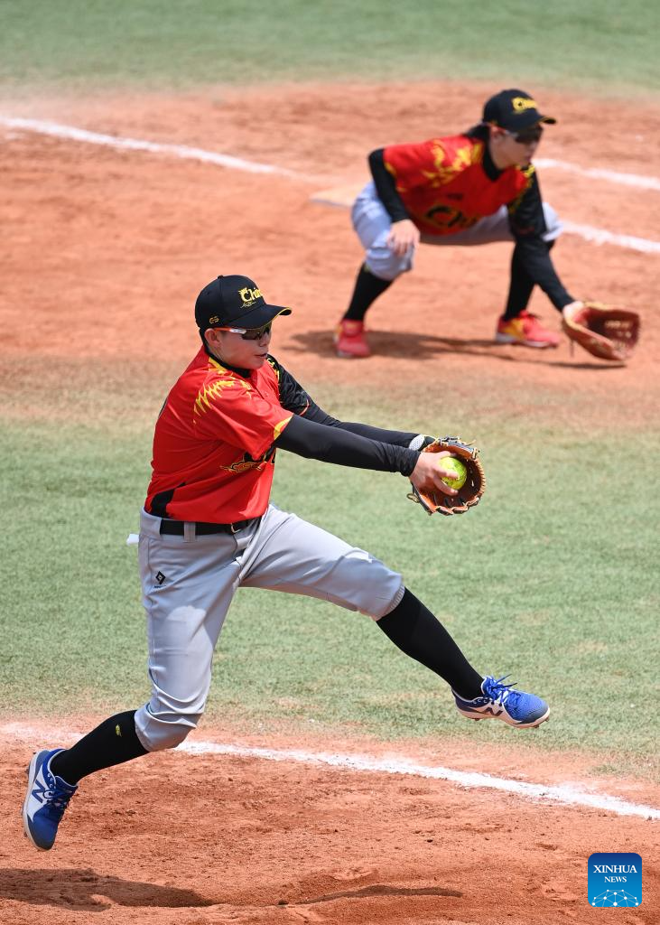Ren Min of China competes during the round robin match between China and Singapore at the WBSC Women Softball Asia Cup 2025 in Xi'an, northwest China's Shaanxi Province, July 16, 2025. (Xinhua/Zou Jingyi)