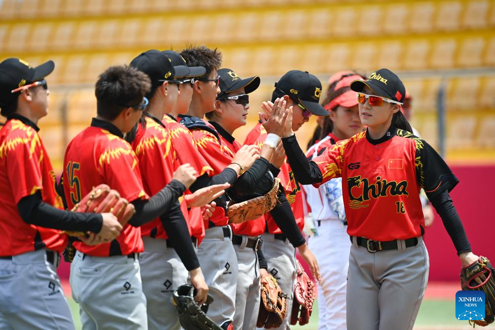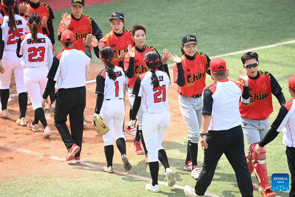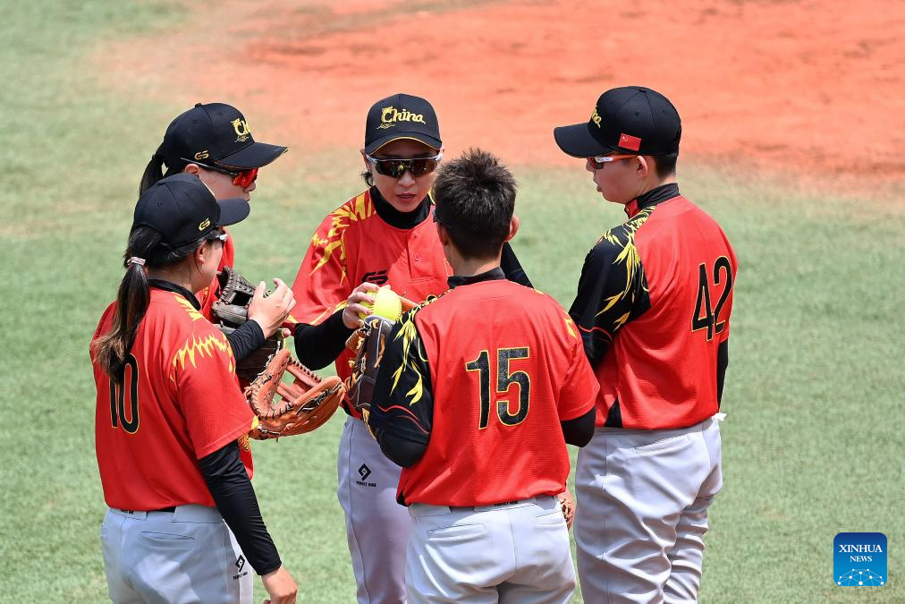 Players of China react during the round robin match between China and Singapore at the WBSC Women Softball Asia Cup 2025 in Xi'an, northwest China's Shaanxi Province, July 16, 2025. (Xinhua/Zou Jingyi)