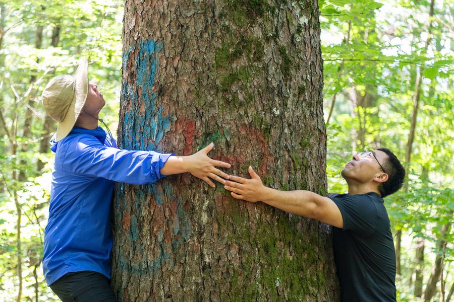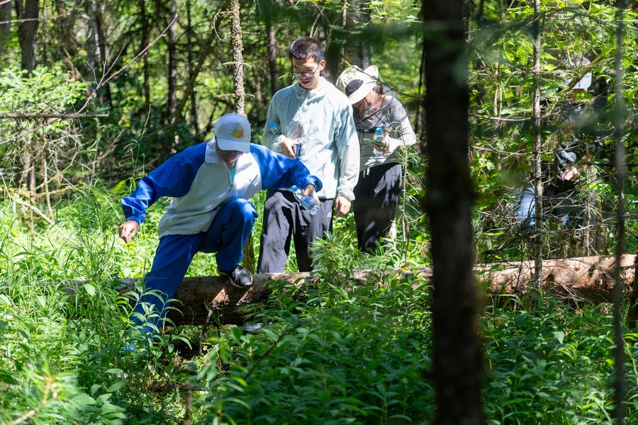 Students from the Northeast Forestry University measure the diameter of a tree trunk at the Liangshui national nature reserve in Yichun City, northeast China's Heilongjiang Province, July 15, 2025. (Xinhua/Xie Jianfei)