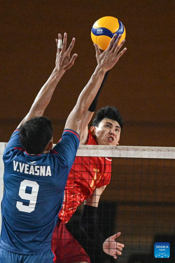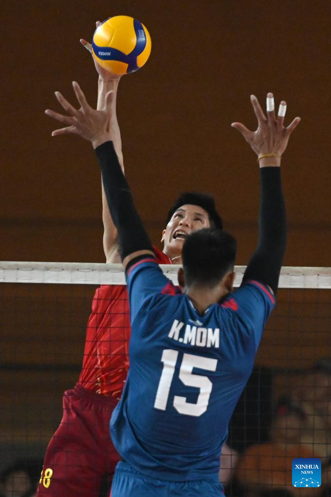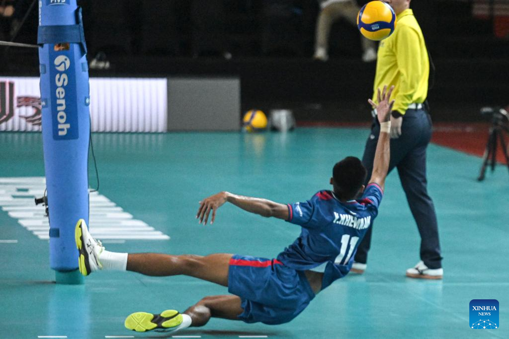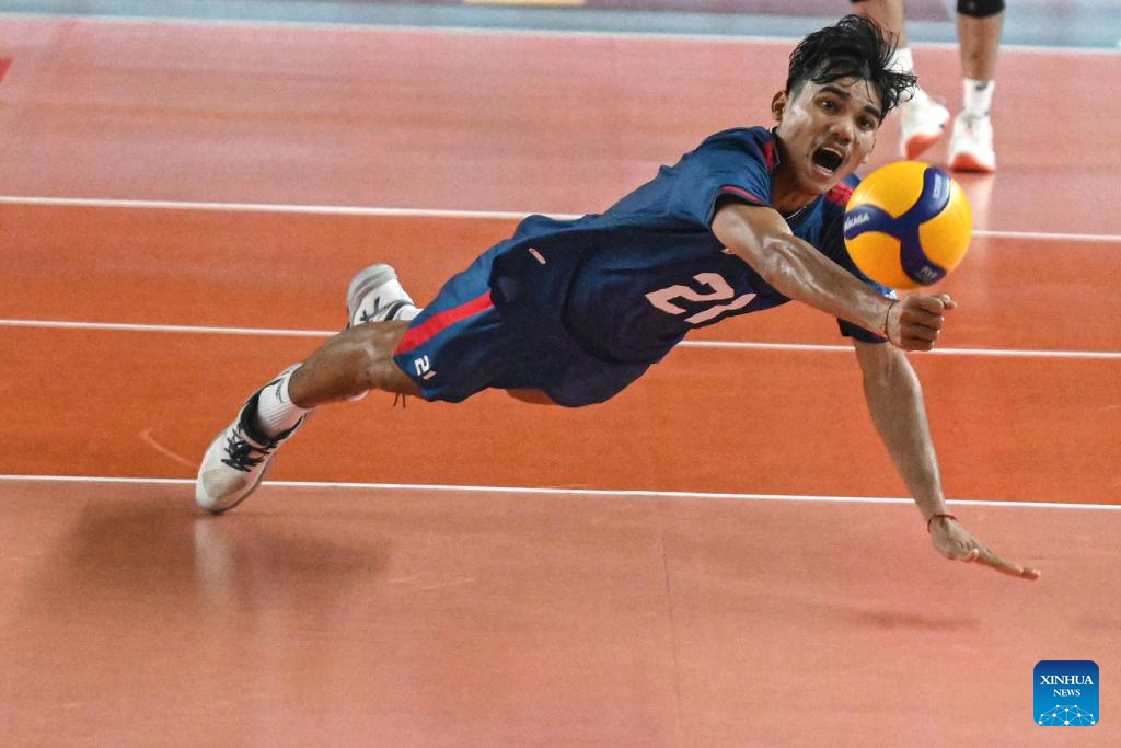 Khemrak Yun of Cambodia saves the ball during the match between Vietnam and Cambodia in the 2nd leg of the Men's SEA Volleyball League in Jakarta, Indonesia, July 16, 2025. (Xinhua/Agung Kuncahya B.)