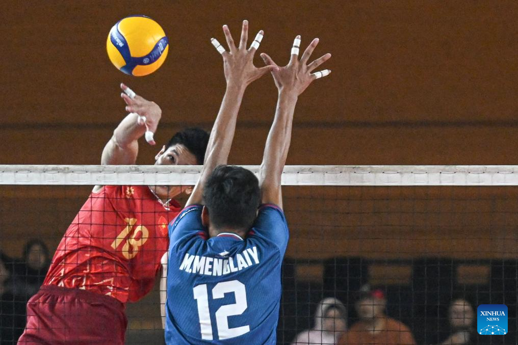 Quoc Du Pham (L) of Vietnam spikes the ball against Mom Kuon of Cambodia during the match between Vietnam and Cambodia in the 2nd leg of the Men's SEA Volleyball League in Jakarta, Indonesia, July 16, 2025. (Xinhua/Agung Kuncahya B.)