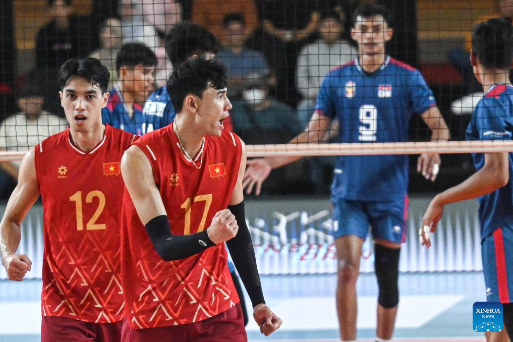 Nguyen Ngoc Thuan (2nd L) of Vietnam reacts during the match between Vietnam and Cambodia in the 2nd leg of the Men's SEA Volleyball League in Jakarta, Indonesia, July 16, 2025. (Xinhua/Agung Kuncahya B.)