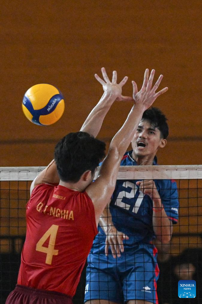 Nguyen Ngoc Thuan (R) of Vietnam spikes the ball against Veasna Voeurn of Cambodia during the match between Vietnam and Cambodia in the 2nd leg of the Men's SEA Volleyball League in Jakarta, Indonesia, July 16, 2025. (Xinhua/Agung Kuncahya B.)
