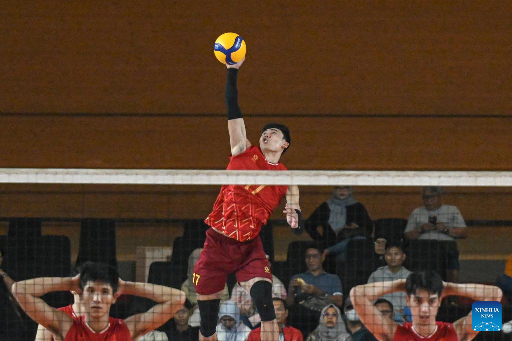 Nguyen Ngoc Thuan (Top) of Vietnam serves during the match between Vietnam and Cambodia in the 2nd leg of the Men's SEA Volleyball League in Jakarta, Indonesia, July 16, 2025. (Xinhua/Agung Kuncahya B.)