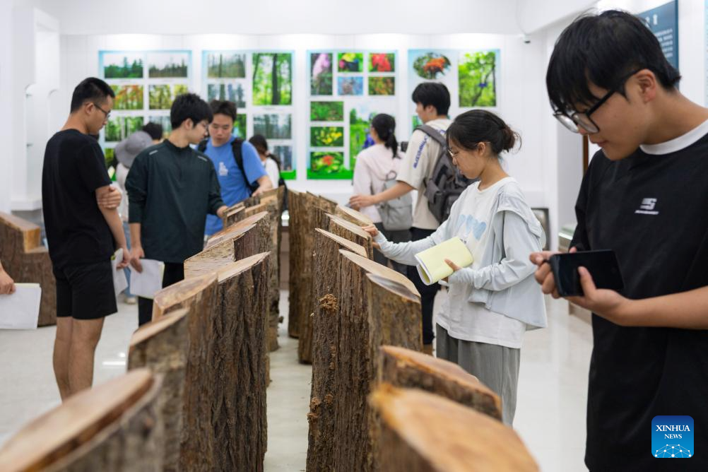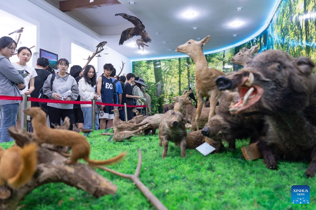 Students from the Northeast Forestry University observe animal specimens at the Liangshui national nature reserve in Yichun City, northeast China's Heilongjiang Province, July 15, 2025. (Xinhua/Xie Jianfei)