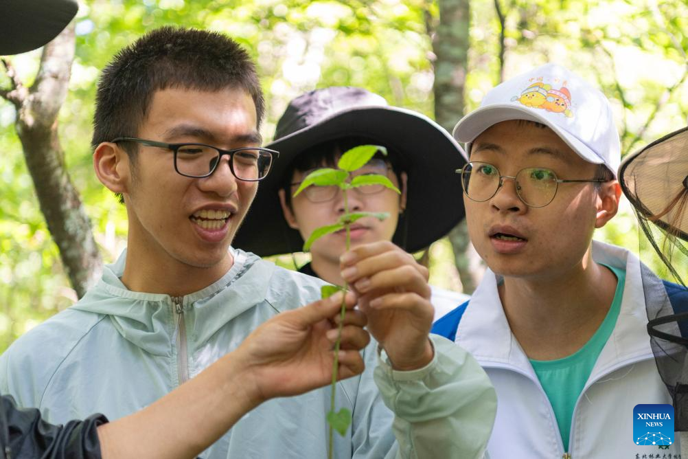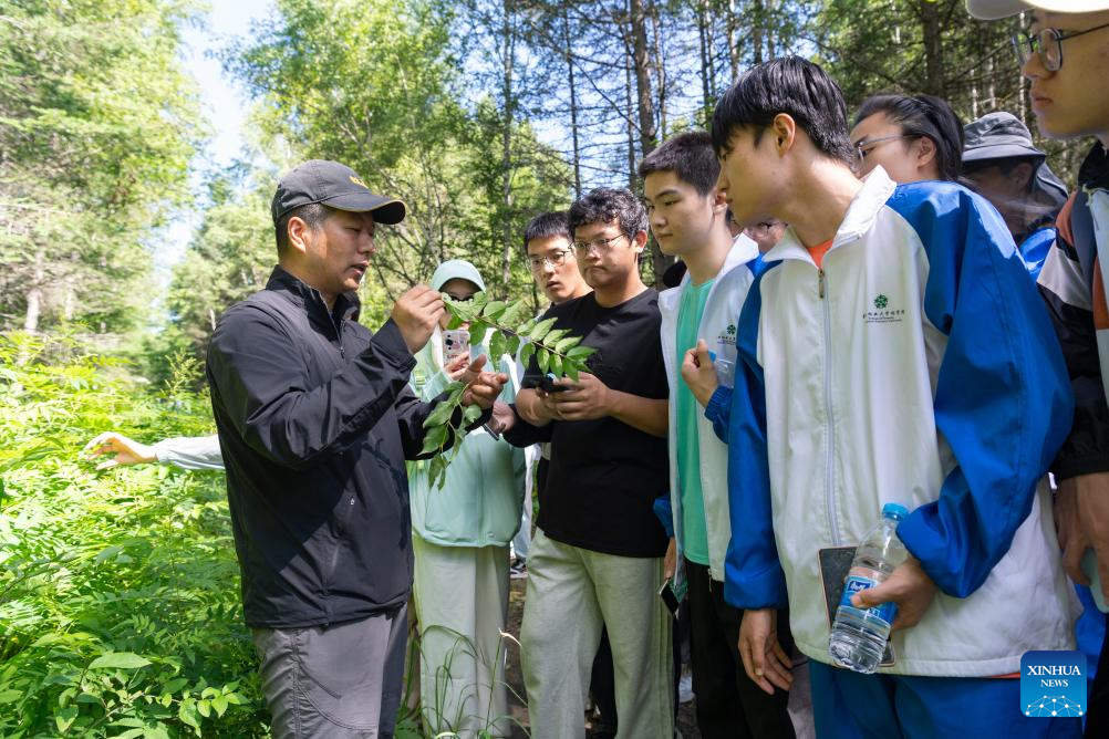 Students from the Northeast Forestry University learn to identify the morphological characteristics of a wild plant at the Liangshui national nature reserve in Yichun City, northeast China's Heilongjiang Province, July 15, 2025.