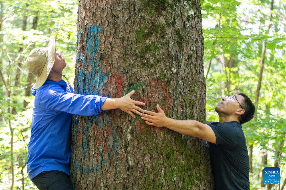 Students from the Northeast Forestry University measure the diameter of a tree trunk at the Liangshui national nature reserve in Yichun City, northeast China's Heilongjiang Province, July 15, 2025. (Xinhua/Xie Jianfei)