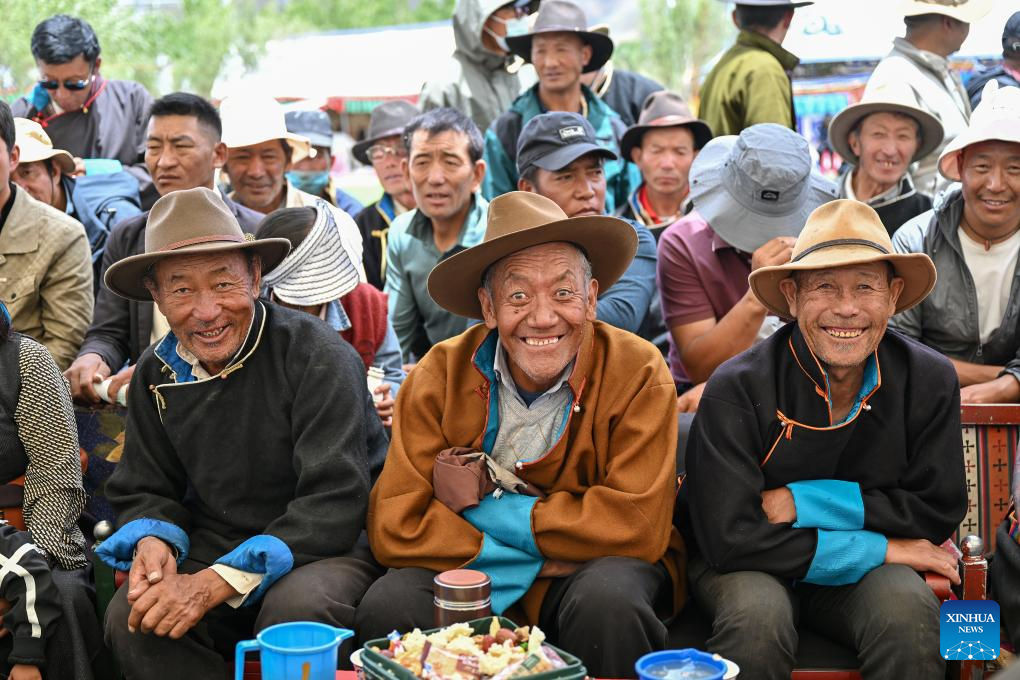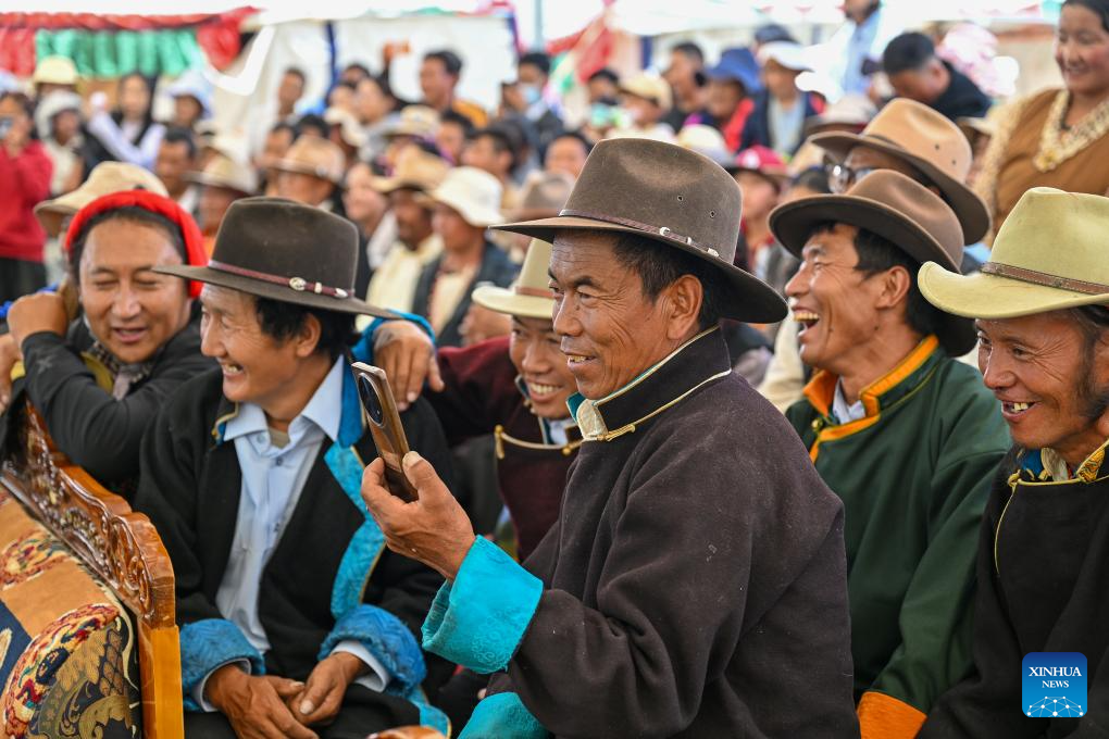 People watch Tibetan opera performance at a park in Namling County of Xigaze City, southwest China's Xizang Autonomous Region, July 16, 2025. Tibetan opera, an olden art that boasts a history of over six centuries, was listed as a national intangible cultural heritage in 2006. Namling County has stepped up in recent years to further popularize this art by regularly staging plays in the neighborhoods and training more professional performers. To date, the county is home to 29 folk Tibetan opera troupes including 876 practitioners, in addition to a 32-strong children's troupe at an average age of 9. (Xinhua/Li Xin)