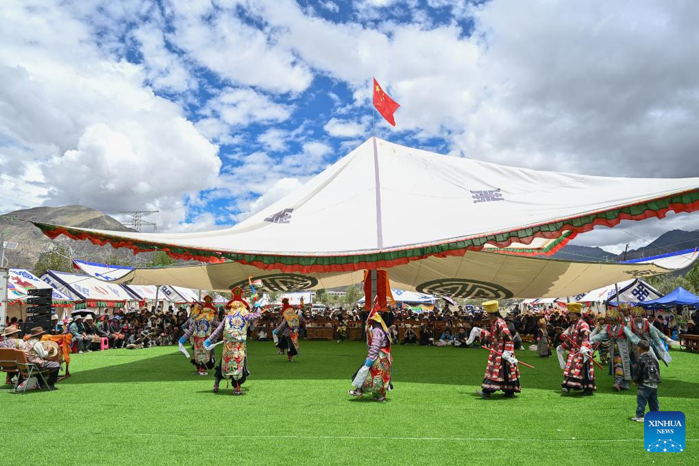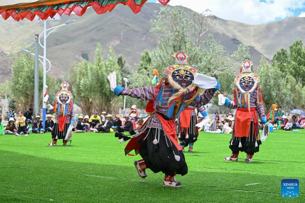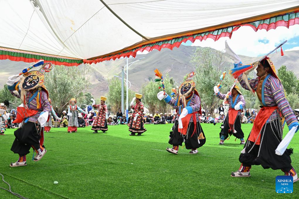 Actors of a folk Tibetan opera troupe perform at a park in Namling County of Xigaze City, southwest China's Xizang Autonomous Region, July 16, 2025. Tibetan opera, an olden art that boasts a history of over six centuries, was listed as a national intangible cultural heritage in 2006. Namling County has stepped up in recent years to further popularize this art by regularly staging plays in the neighborhoods and training more professional performers. To date, the county is home to 29 folk Tibetan opera troupes including 876 practitioners, in addition to a 32-strong children's troupe at an average age of 9. (Xinhua/Li Xin)