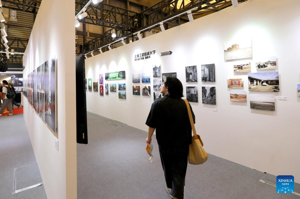 A visitor views photographic works at the Photo and Imaging Shanghai 2025 in Shanghai, east China, July 17, 2025. The event, with the participation of over 400 enterprises from the global digital imaging industry, showcases the latest business forms and trends in the visual imaging industry in terms of digital shooting equipment, image output and production technology. (Xinhua/Fang Zhe)