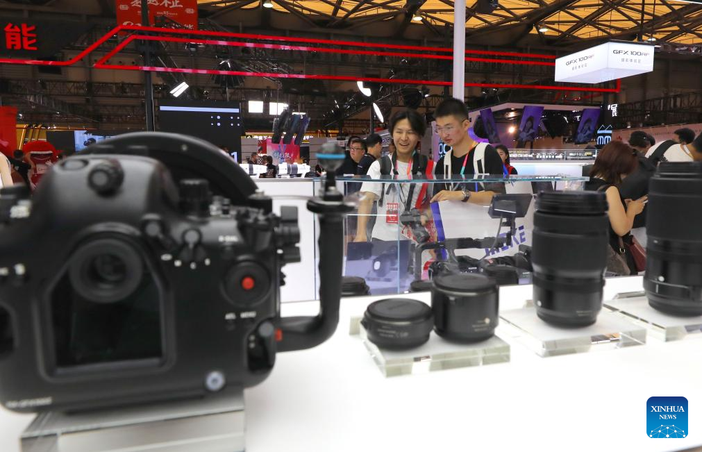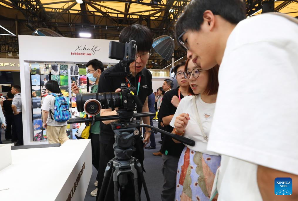 Visitors learn about cameras and lens at a booth during the Photo and Imaging Shanghai 2025 in Shanghai, east China, July 17, 2025. The event, with the participation of over 400 enterprises from the global digital imaging industry, showcases the latest business forms and trends in the visual imaging industry in terms of digital shooting equipment, image output and production technology. (Xinhua/Fang Zhe)