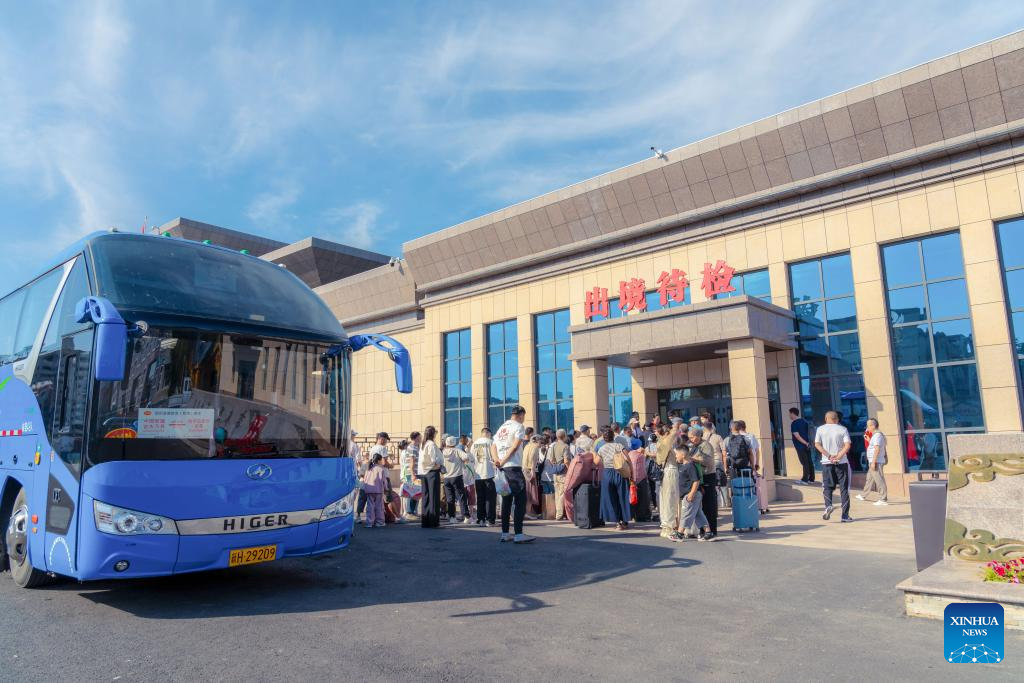 Tourists queue for emigration check at the Jeminay Port station in Altay region, northwest China's Xinjiang Uygur Autonomous Region, July 10, 2025. Jeminay Port, a Class I national land port in Xinjiang's Altay region, bordering Kazakhstan, has seen a surge in tourist traffic since the implementation of the China-Kazakhstan 30-day mutual visa exemption policy. (Photo by Chen Yawei/Xinhua)