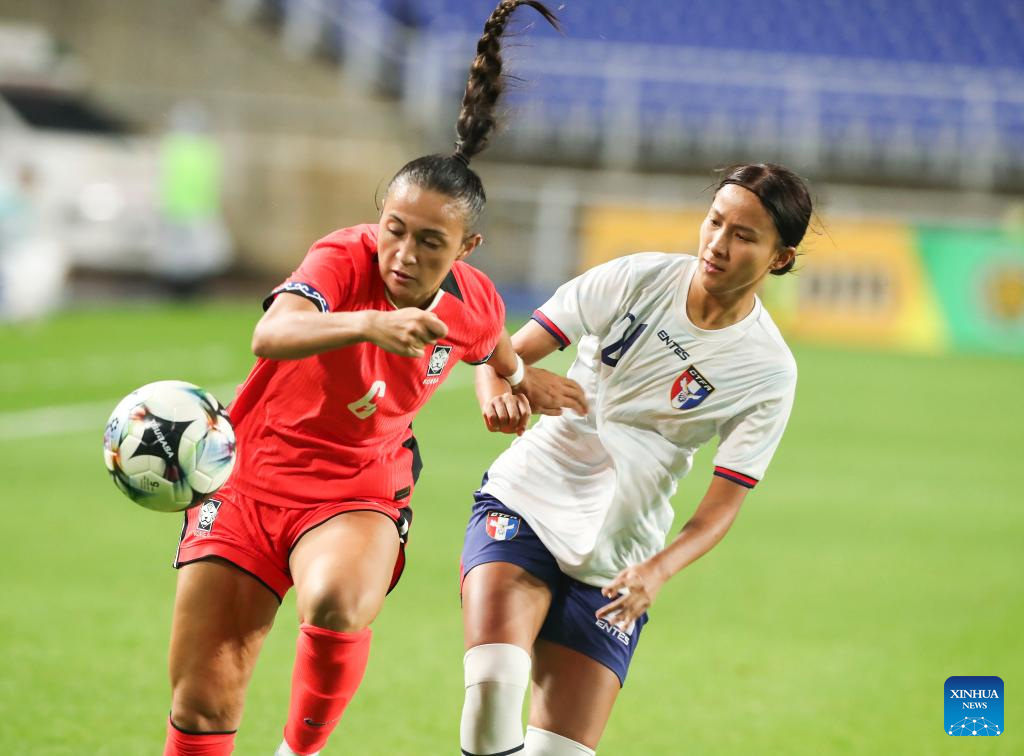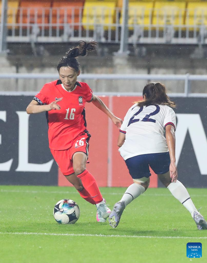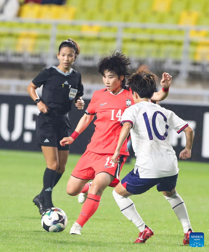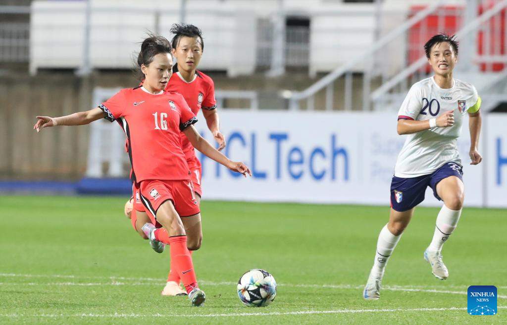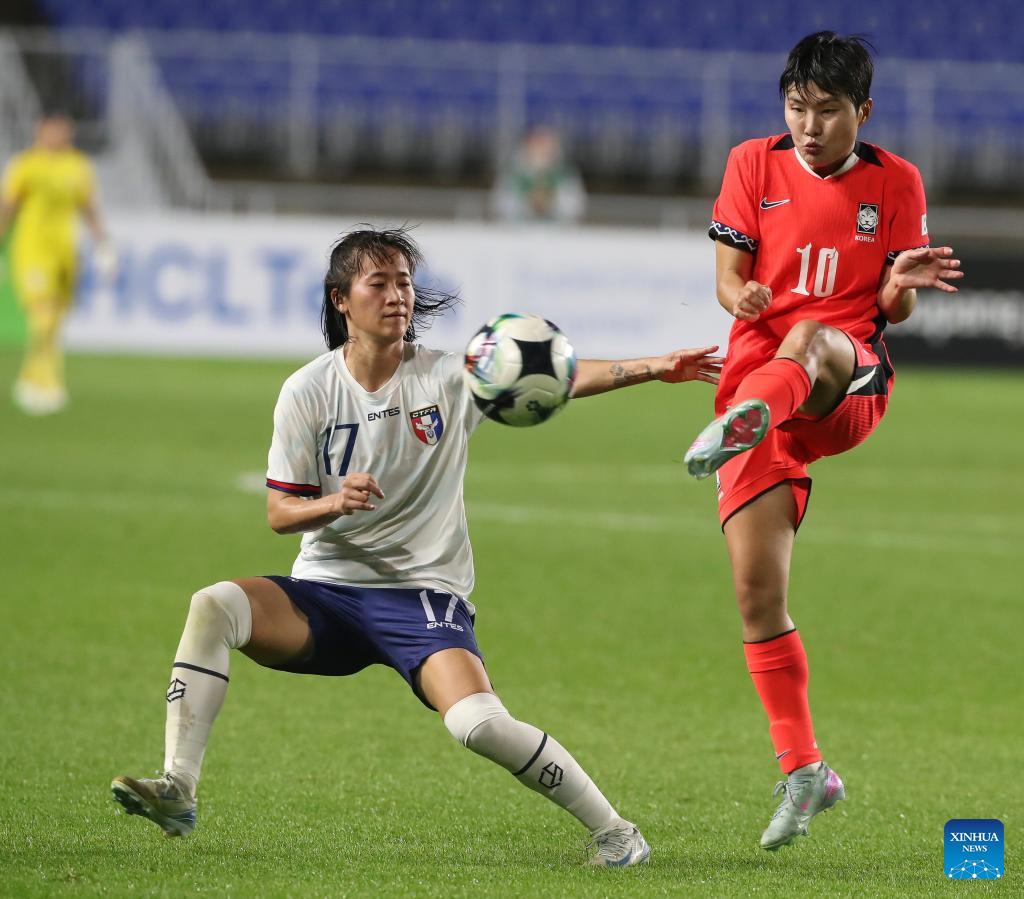 Jang Selgi (L) of South Korea kicks the ball during the women's match between South Korea and Chinese Taipei at the EAFF (East Asian Football Federation) E-1 Football Championship 2025 Final in Suwon, South Korea, July 16, 2025. (Xinhua/Yao Qilin)