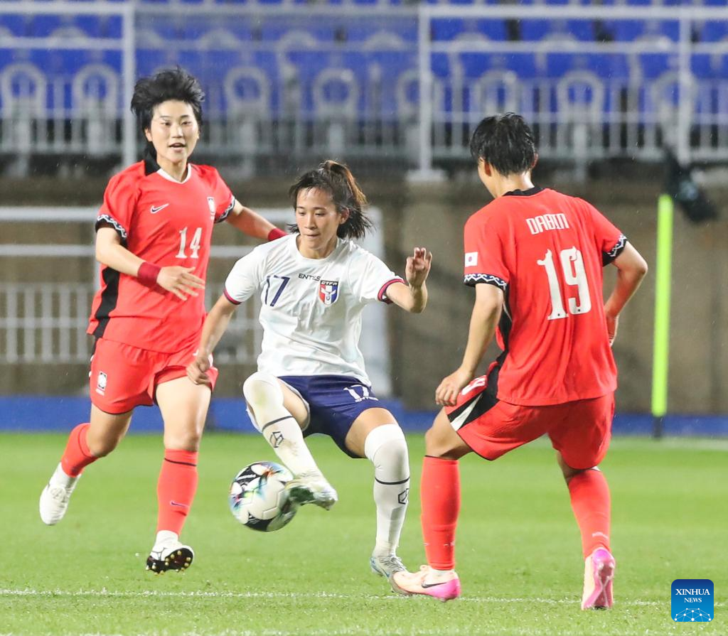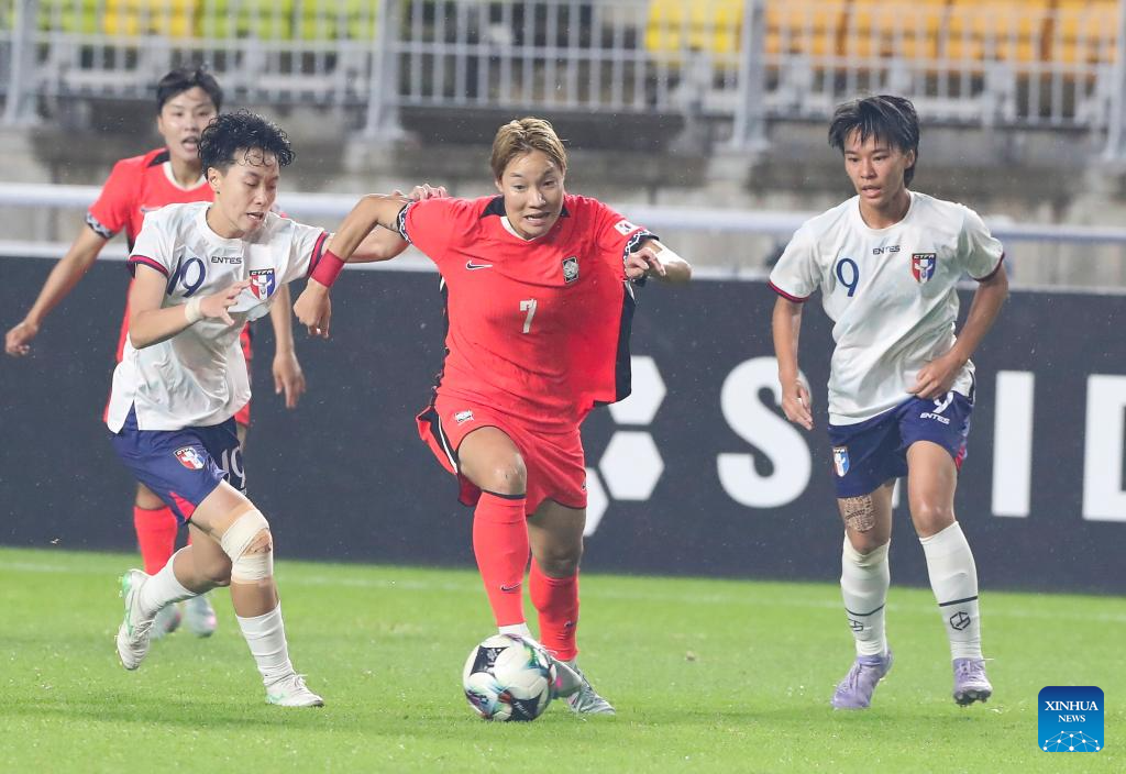 Jeong Dabin (R) of South Korea vies with Chen Jin-wen (C) of Chinese Taipei during the women's match between South Korea and Chinese Taipei at the EAFF (East Asian Football Federation) E-1 Football Championship 2025 Final in Suwon, South Korea, July 16, 2025. (Xinhua/Yao Qilin)