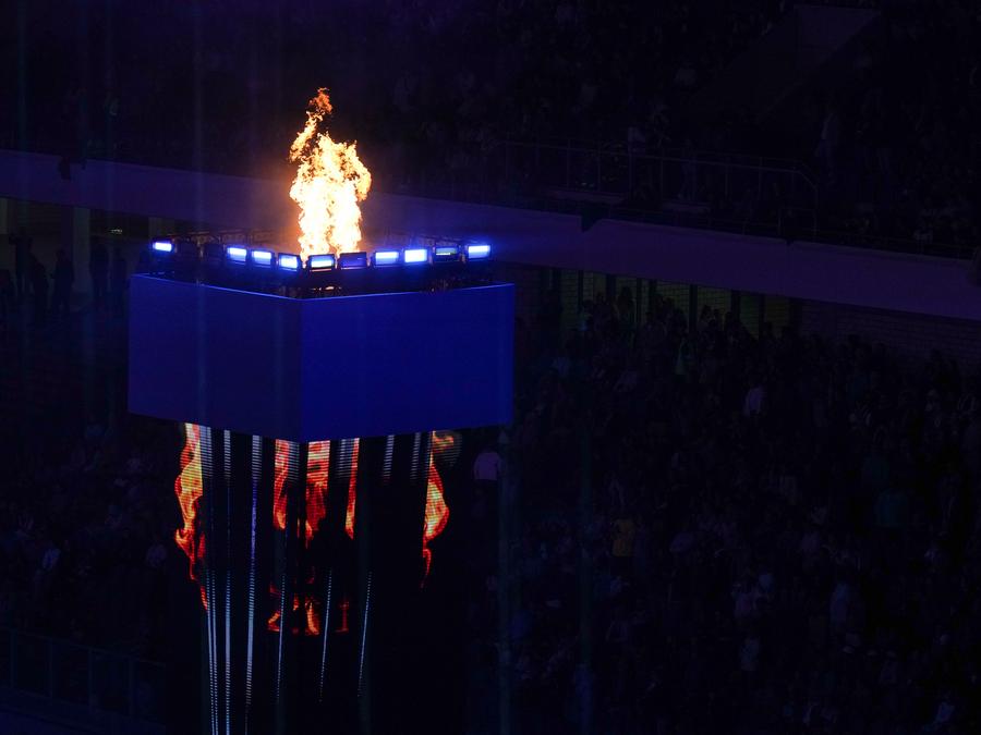 The flames slowly rose virtually, accompanied by the anthem "Now and Together." At the climax of Jan Loechet's song, real flames are ignited on the six towers, representing all the competing cities of the Rhine-Ruhr University Games.