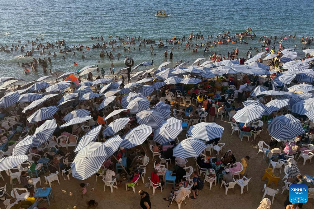 People cool off at a beach of the Mediterranean Sea during a heatwave in Alexandria, Egypt, on July 16, 2025. Egypt is experiencing an exceptional heatwave, with high temperatures and humidity posing significant risks to public health and impacting key sectors such as agriculture and industry. (Xinhua/Ahmed Gomaa)