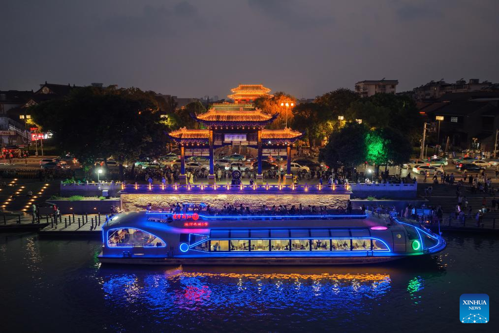 An aerial drone photo shows a cruise ship sailing on the ancient canal in Yangzhou, east China's Jiangsu Province, July 17, 2025. In recent years, Yangzhou has implemented a night landscape upgrade project of the ancient canal, and organized night tours and night markets to improve tourists' consumption experience. (Photo by Meng Delong/Xinhua)