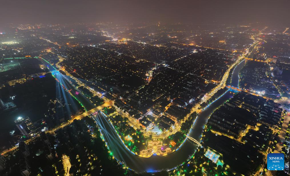 An aerial drone photo shows a night view of the ancient canal in Yangzhou, east China's Jiangsu Province, July 17, 2025. In recent years, Yangzhou has implemented a night landscape upgrade project of the ancient canal, and organized night tours and night markets to improve tourists' consumption experience. (Photo by Meng Delong/Xinhua)