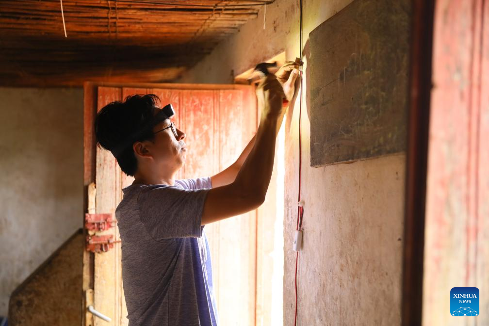 Two students from the Hong Kong Polytechnic University install electrical wiring in a villager's house in Gisagara District, Rwanda, on July 16, 2025. Braving the heat and dust in Rwanda's southern Gisagara District, more than 100 students and teachers from the Hong Kong Polytechnic University (PolyU) recently arrived in rural villages to install solar panels and indoor lighting systems.