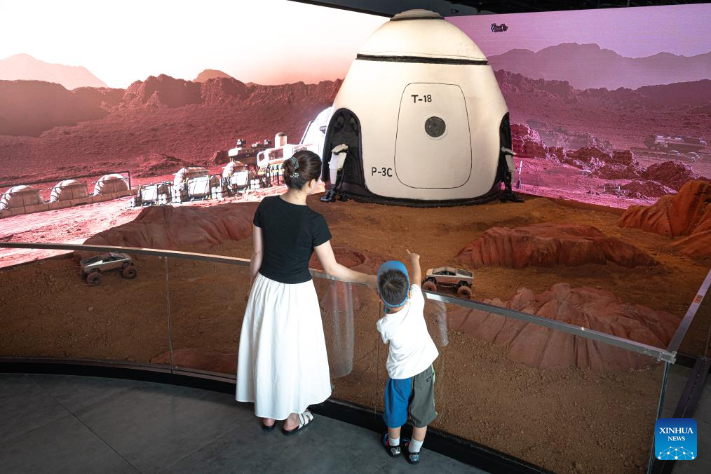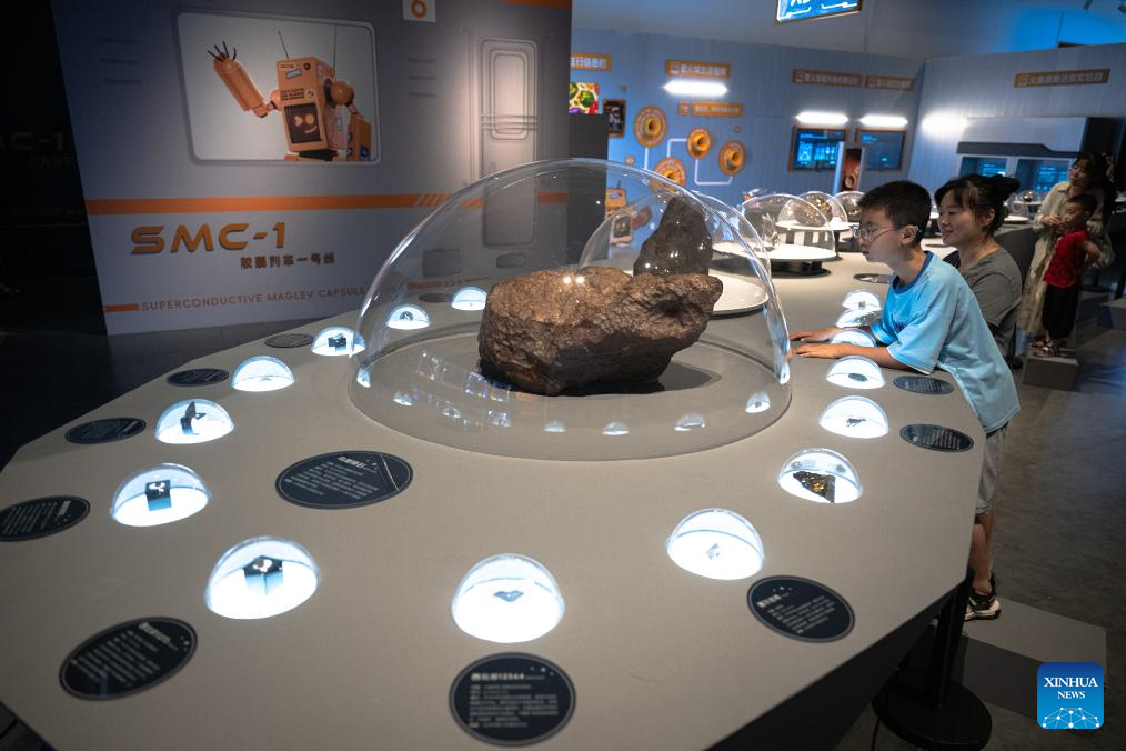 People visit a science fiction-themed planetary science experience exhibition at China Building Science Museum in Wuhan, central China's Hubei Province, July 18, 2025. The exhibition opened here on Friday featuring over 10 interactive exhibits and more than 30 meteorites on display. It will last until March 29, 2026. (Xinhua/Xiao Yijiu)