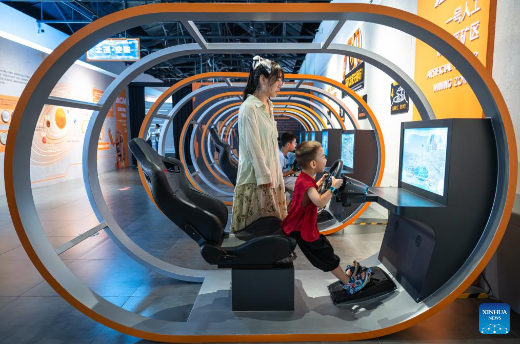 A boy drives a simulated Mars engineering vehicle at a science fiction-themed planetary science experience exhibition at China Building Science Museum in Wuhan, central China's Hubei Province, July 18, 2025. The exhibition opened here on Friday featuring over 10 interactive exhibits and more than 30 meteorites on display. It will last until March 29, 2026. (Xinhua/Xiao Yijiu)