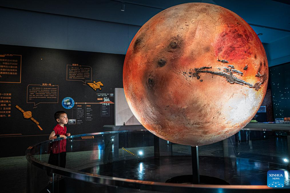 A boy visits a science fiction-themed planetary science experience exhibition at China Building Science Museum in Wuhan, central China's Hubei Province, July 18, 2025. The exhibition opened here on Friday featuring over 10 interactive exhibits and more than 30 meteorites on display. It will last until March 29, 2026. (Xinhua/Xiao Yijiu)