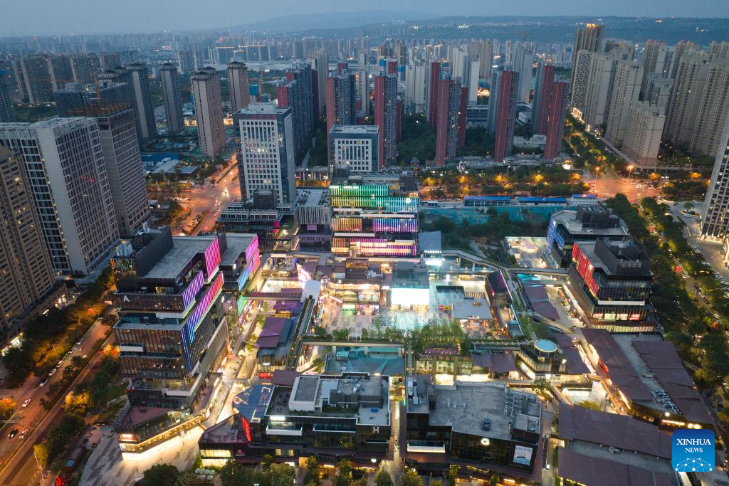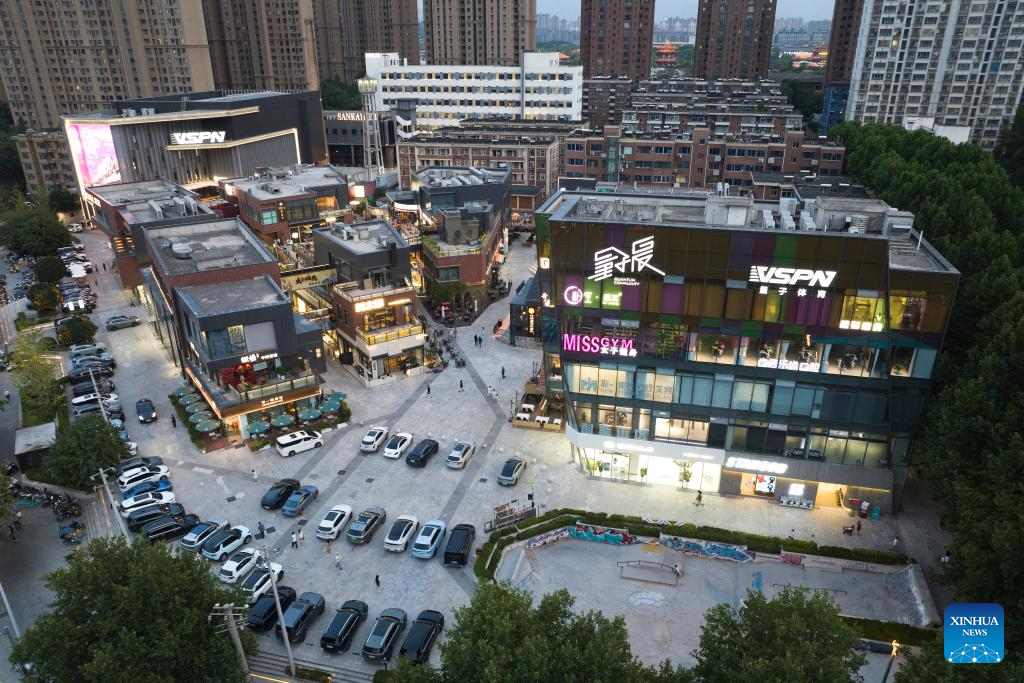 An aerial drone photo shows a view of Qujiang Creative Circle in Xi'an, northwest China's Shaanxi Province, July 16, 2025. In recent years, Xi'an has pushed forward commercial street renovation and development in coordination with the protection of historical and cultural sites. A bunch of high-quality urban renewal programs have injected new vitality into this millennia-old city. (Xinhua/Shao Rui)
