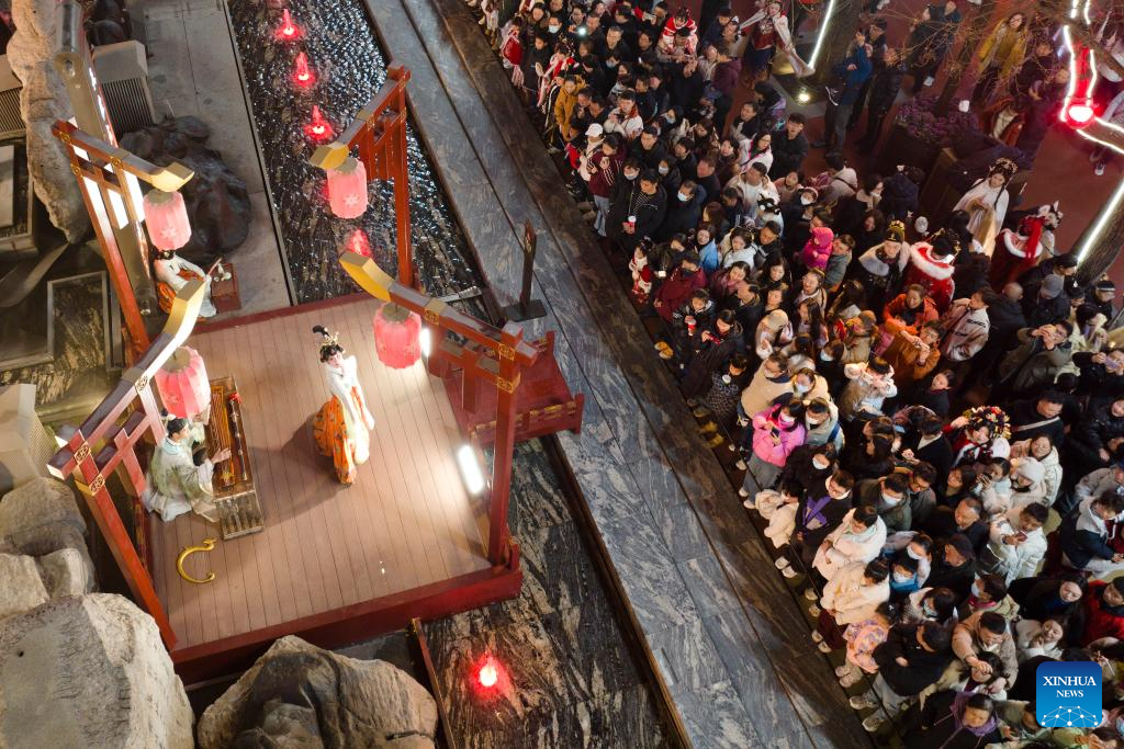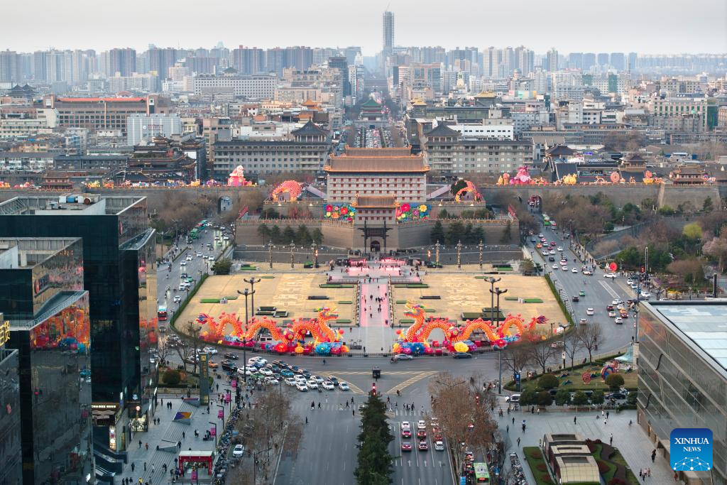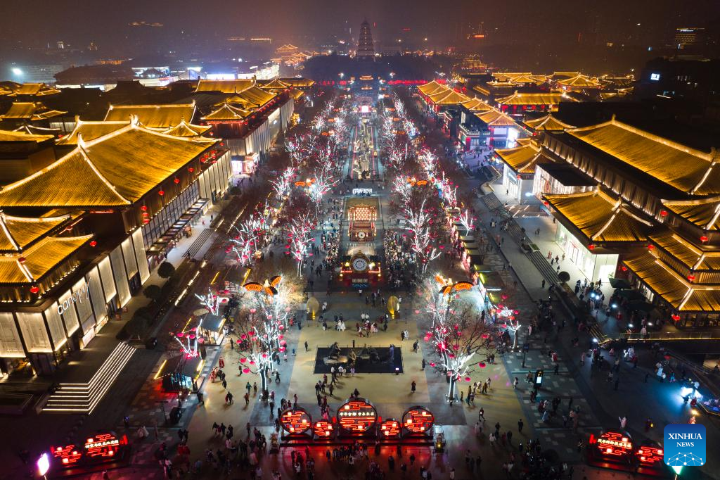 An aerial drone photo shows tourists watching a melodrama at the Grand Tang Dynasty Ever Bright City, a popular tourist attraction in Xi'an, northwest China's Shaanxi Province, Jan. 22, 2025. In recent years, Xi'an has pushed forward commercial street renovation and development in coordination with the protection of historical and cultural sites. A bunch of high-quality urban renewal programs have injected new vitality into this millennia-old city. (Xinhua/Shao Rui)