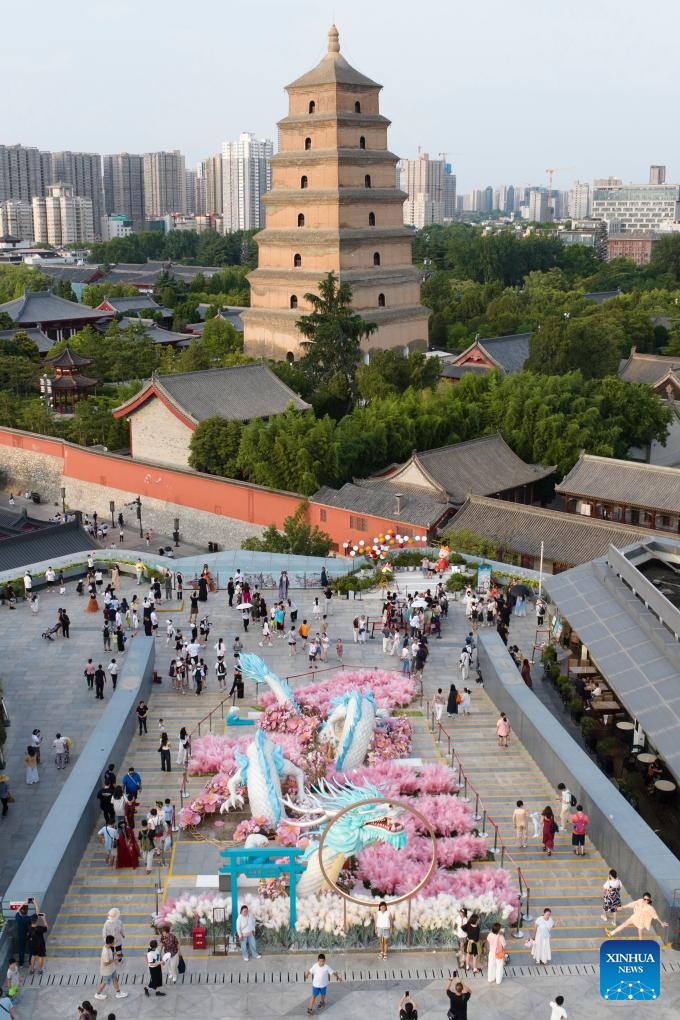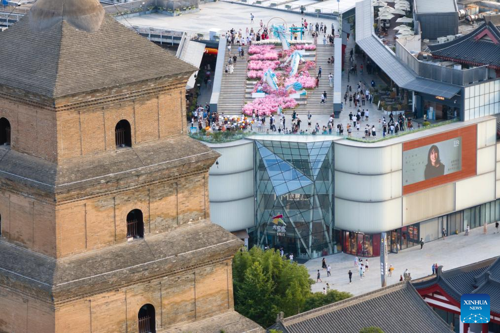 An aerial drone photo shows tourists on a sightseeing platform near the Giant Wild Goose Pagoda in Xi'an, northwest China's Shaanxi Province, July 16, 2025. In recent years, Xi'an has pushed forward commercial street renovation and development in coordination with the protection of historical and cultural sites. A bunch of high-quality urban renewal programs have injected new vitality into this millennia-old city. (Xinhua/Shao Rui)