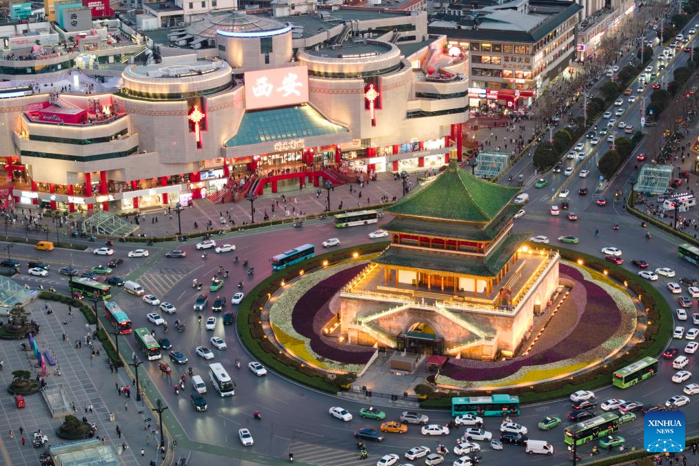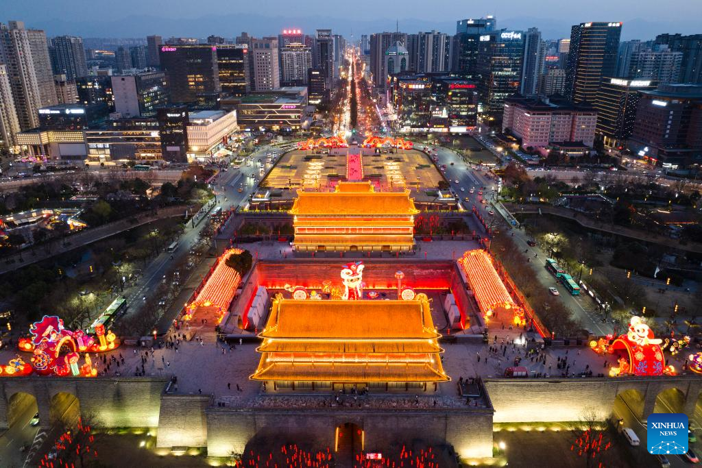 An aerial drone photo shows a night view of the South Gate business district in Xi'an, northwest China's Shaanxi Province, March 19, 2025. In recent years, Xi'an has pushed forward commercial street renovation and development in coordination with the protection of historical and cultural sites. A bunch of high-quality urban renewal programs have injected new vitality into this millennia-old city. (Xinhua/Shao Rui)
