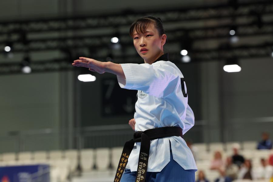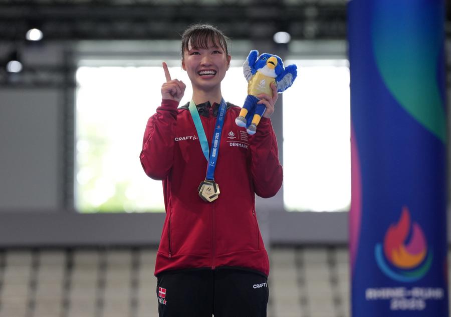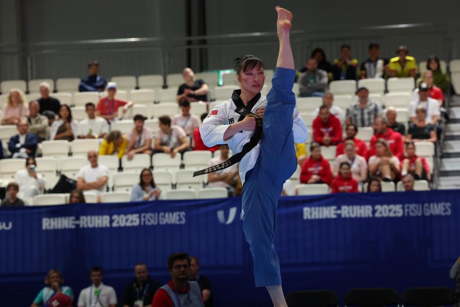ESSEN, Germany, July 17 (Xinhua) -- With a Danish flag wrapped around her shoulders, taekwondo athlete Eva Eun-Kyung Sandersen raced around the venue Thursday after claiming the first gold of the Rhine-Ruhr World University Games in the women's individual poomsae with a score of 8.732.