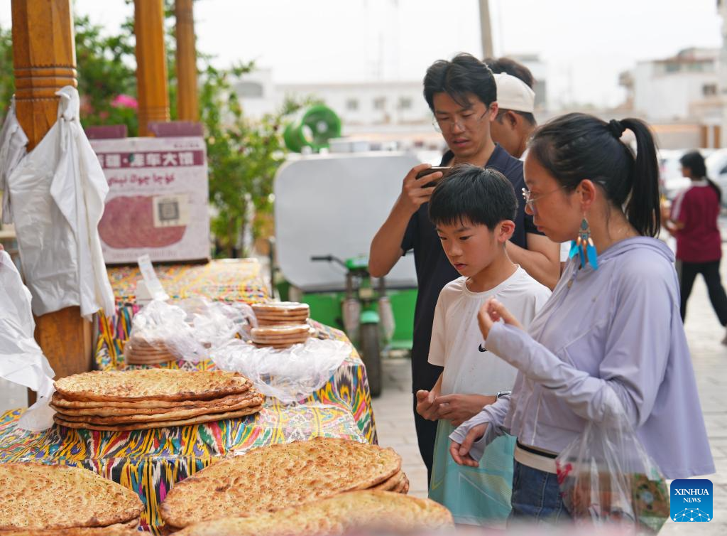 Tourists buy naan bread, a specialty food, at the Qiuci Alley in Kuqa City, northwest China's Xinjiang Uygur Autonomous Region, on July 17, 2025. Kuqa City in recent years has continuously renovated and upgraded the Qiuci Alley ("Qiuci" is a Chinese pinyin form of Kuqa), which sits at the core area of the city. While retaining the original layout of the historical street, the renovation aimed to improve the habitat environment and enrich tourists' experience. (Xinhua/Li Xiao)